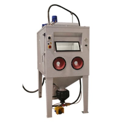 The blast cabinet operates with a compressed air system. The shotblasting vessel is constructed at the shotblasting funnel directly under the working area space and provided with wear resistant parts which require minimum maintenance.