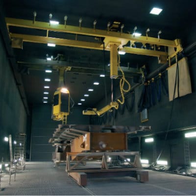 The Blastman B20CS is a bridge type 8-axis blast cleaning robot designed to blast large work pieces. The B20CS has two separate bridges: one to carry the robot arm and one to carry the movable operator cabin. An operator can steer the robot with joysticks from the operator cabin which moves on 4-axis. When the B20CS is used as a robot the operator cabin bridge can be driven into the other end of the blast room.