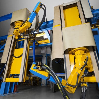 A pair of Blastman B16S robots combined with overhead (monorail) conveyor provide an efficient and flexible blasting solution for even the most complicated work pieces.
